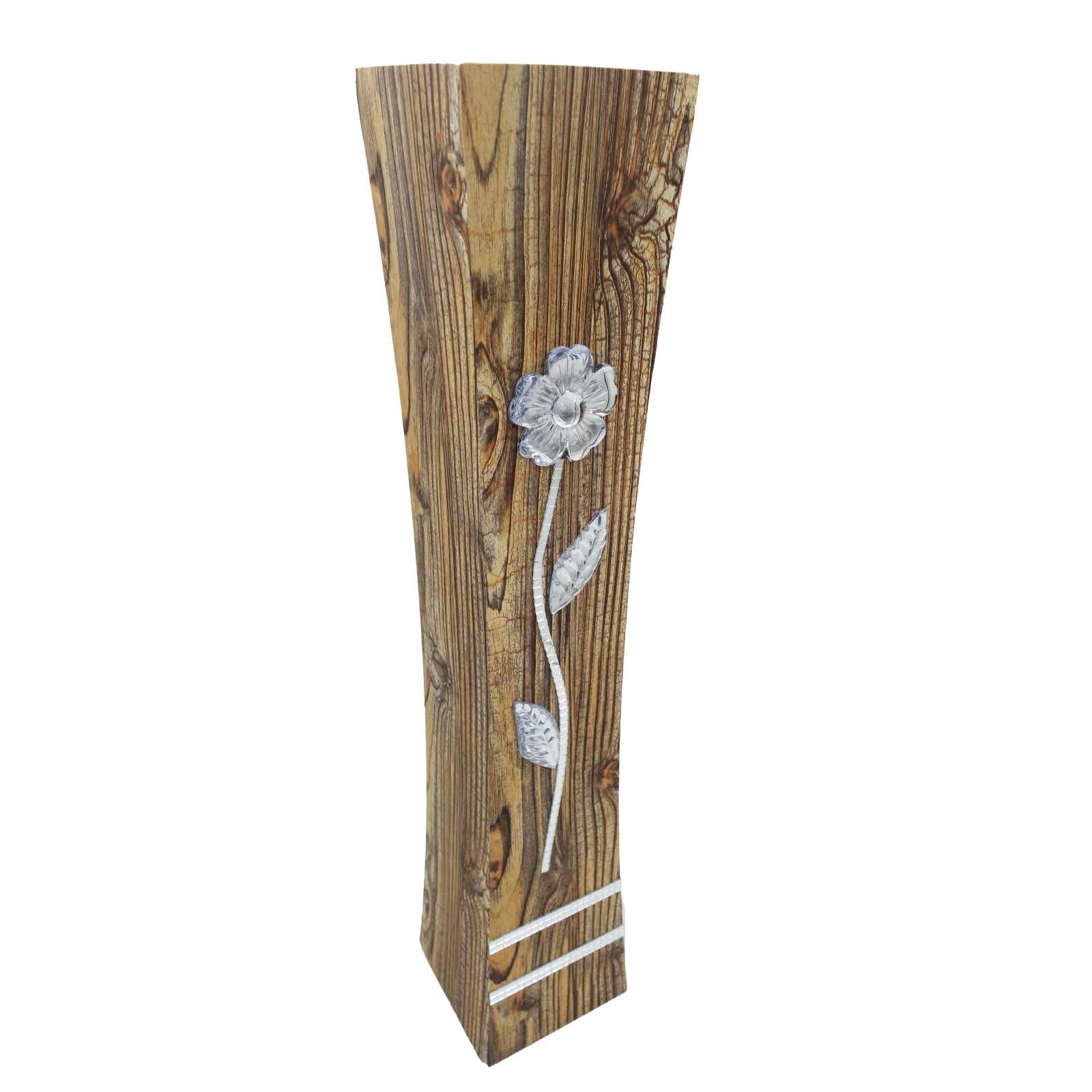 Această vază decorativă din MDF imită fidel o bucată de lemn natural, cu textură vizibilă, noduri și fibre verticale. Pe suprafața frontală este aplicat un model floral alb, realizat din pietre decorative cu aspect de cristal, care adaugă un contrast elegant și subtil. Cu o înălțime de 58 cm, este ideală pentru decoruri rustice, naturale sau minimaliste.