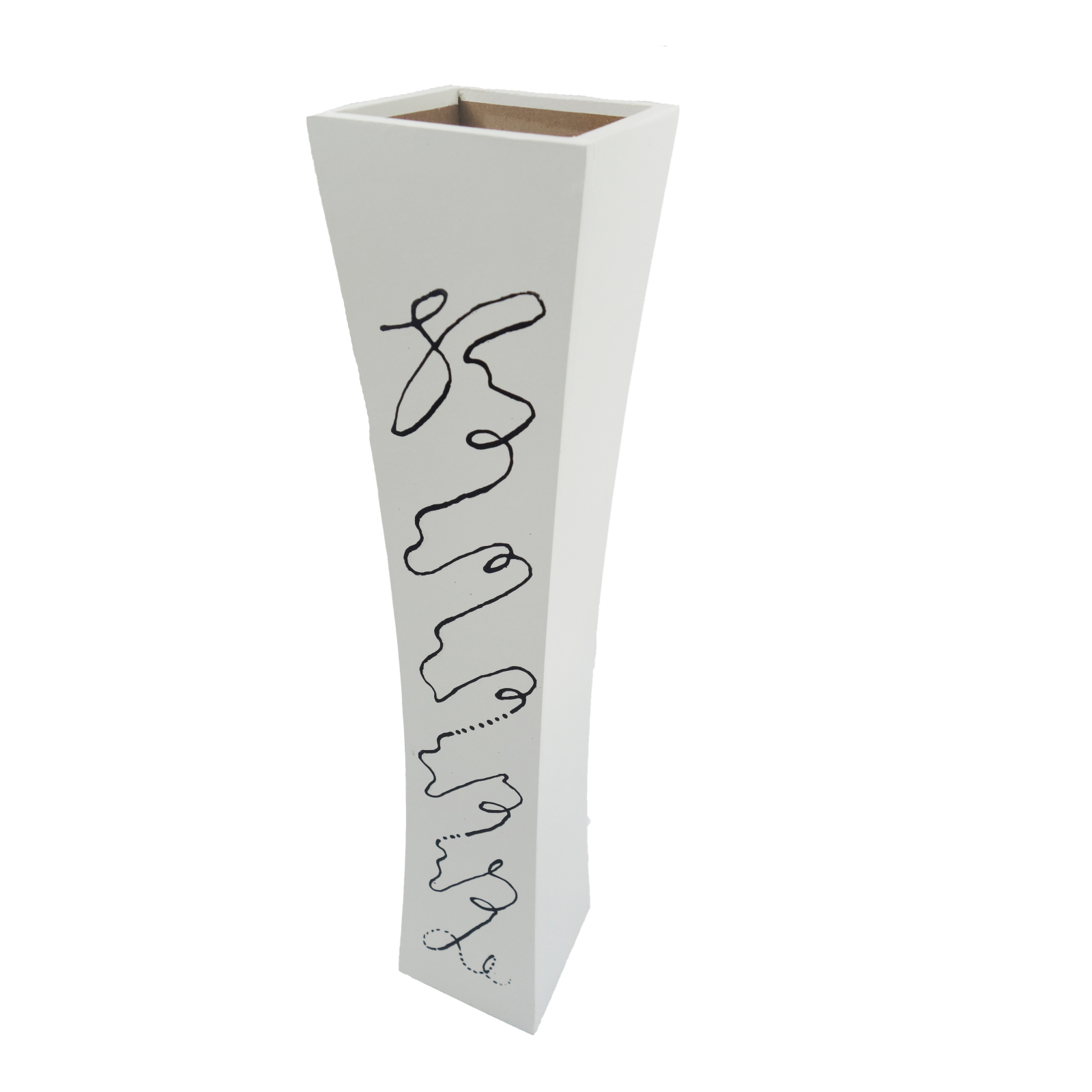Această vază decorativă din MDF are un finisaj alb și un imprimeu artistic în tonuri de negru și maro, cu motive vegetale și linii curbe. Cu o formă elegantă, ușor evazată, și o înălțime de 58 cm, este ideală pentru decoruri moderne, clasice sau orientale. Contrastul dintre alb și modelul închis oferă un efect vizual rafinat și echilibrat.