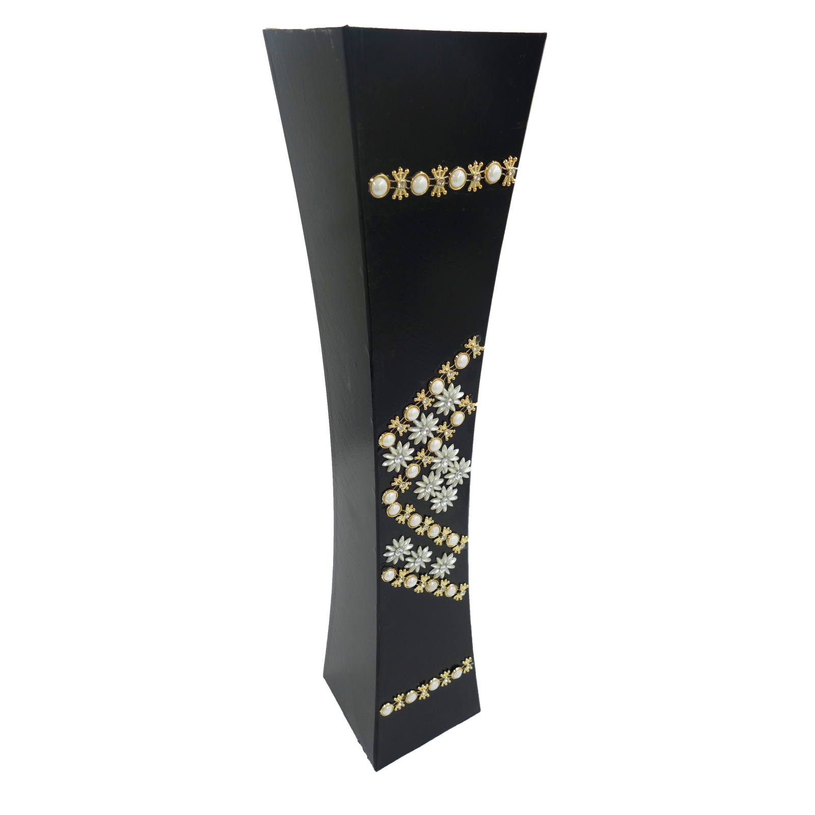 Această vază elegantă din MDF, cu finisaj negru și aplicații decorative din pietricele și motive florale aurii, adaugă un plus de rafinament oricărui spațiu. Cu o înălțime de 58 cm, este ideală ca piesă de accent în decoruri moderne, glam sau orientale. Detaliile simetrice și contrastul dintre negru, alb și auriu o transformă într-un obiect decorativ cu adevărat special.