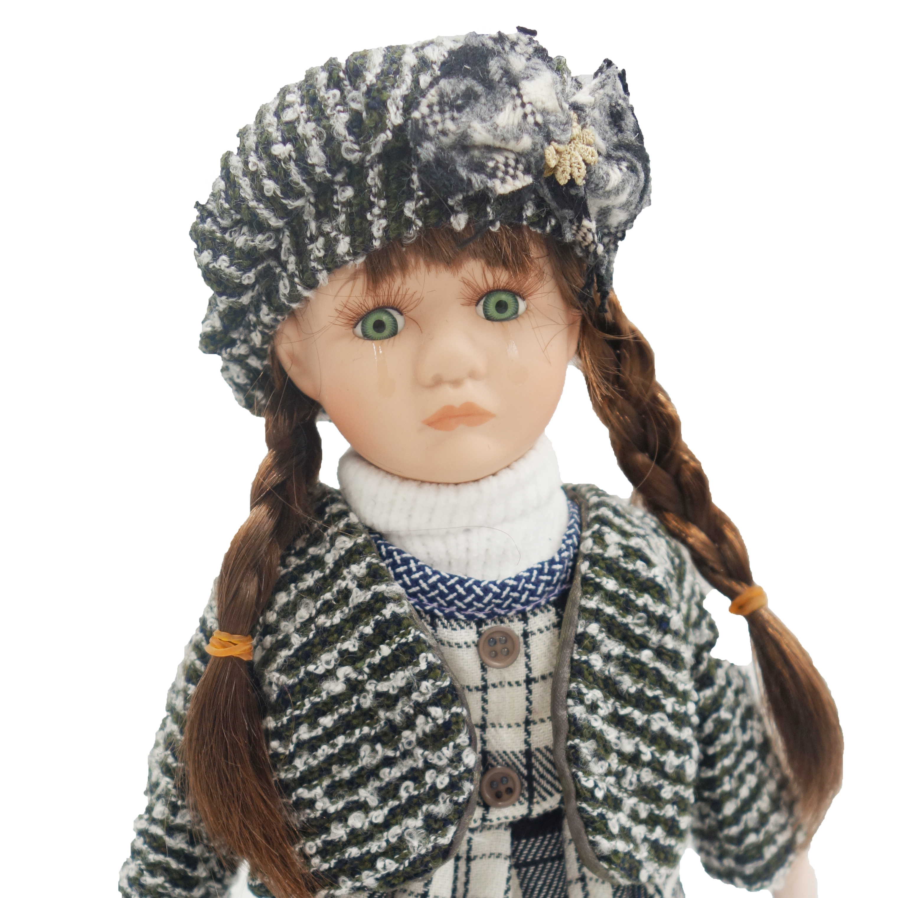 Păpușă de colecție realizată din porțelan fin și material textil de calitate. Capul și mâinile sunt din porțelan, iar corpul flexibil o face ideală pentru expunere în vitrine sau decor vintage. Este îmbrăcată într-o rochie victoriană în nuanțe de verde negru și alb, cu volane, dantelă și aplicații florale.