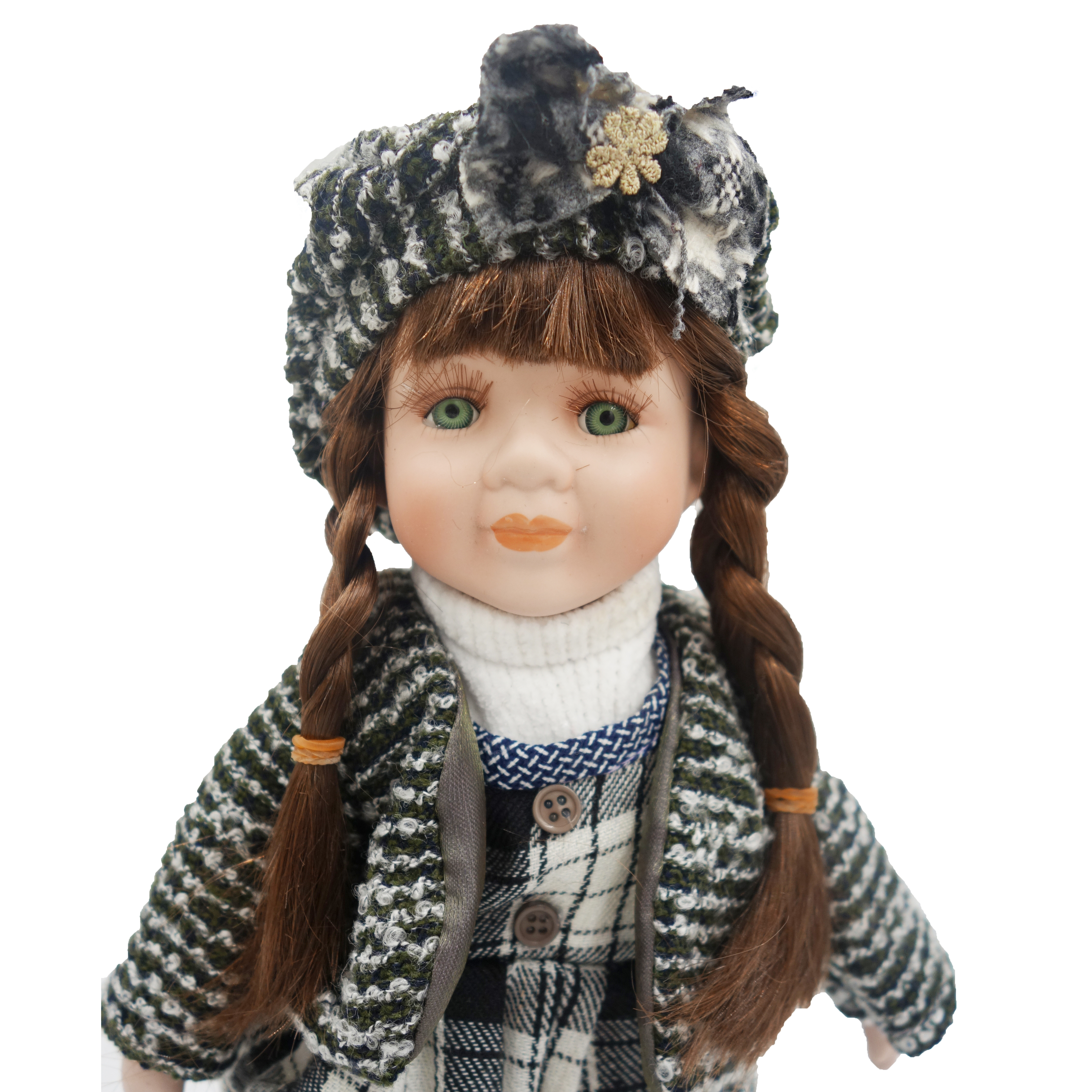 Accesoriile includ o bonetă decorată cu flori artificiale. Părul saten este lung și impletit cu grijă, iar trăsăturile feței sunt pictate manual cu finețe.