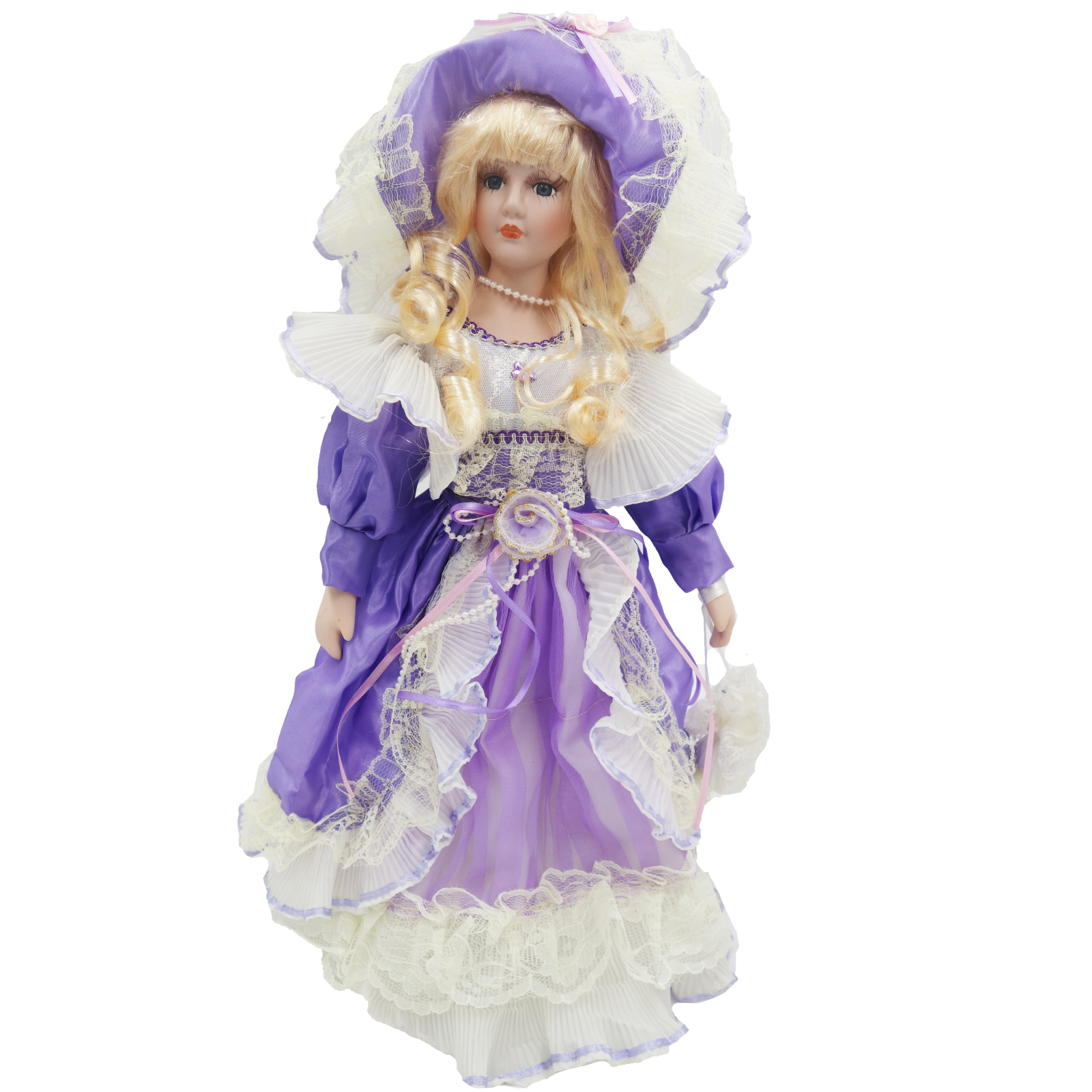 Păpușă din porțelan, de colecție, rochie victoriana, mov, cu suport, 45 cm
