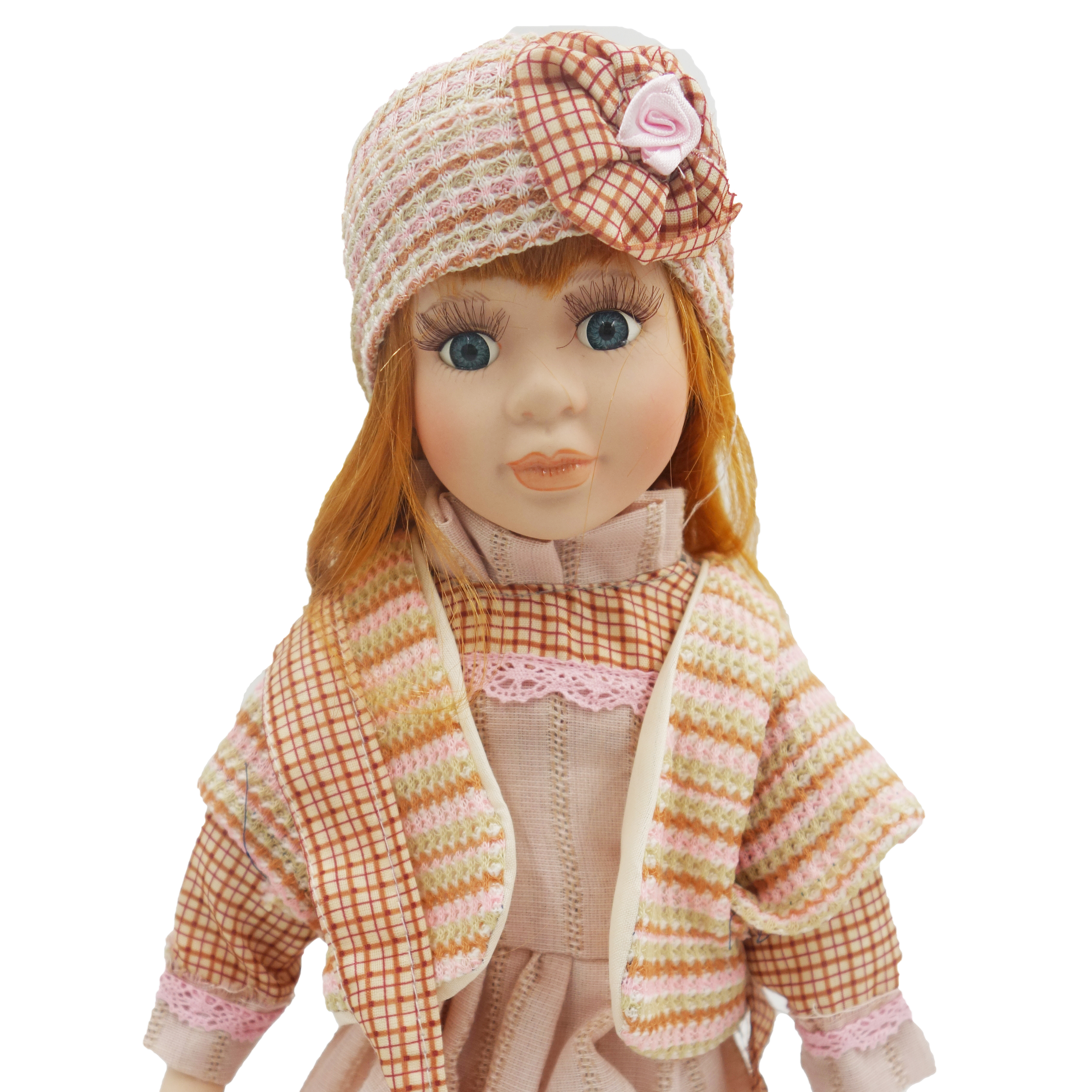 Păpușă de colecție, din porțelan, ținută casual vintage, cu suport, 45 cm